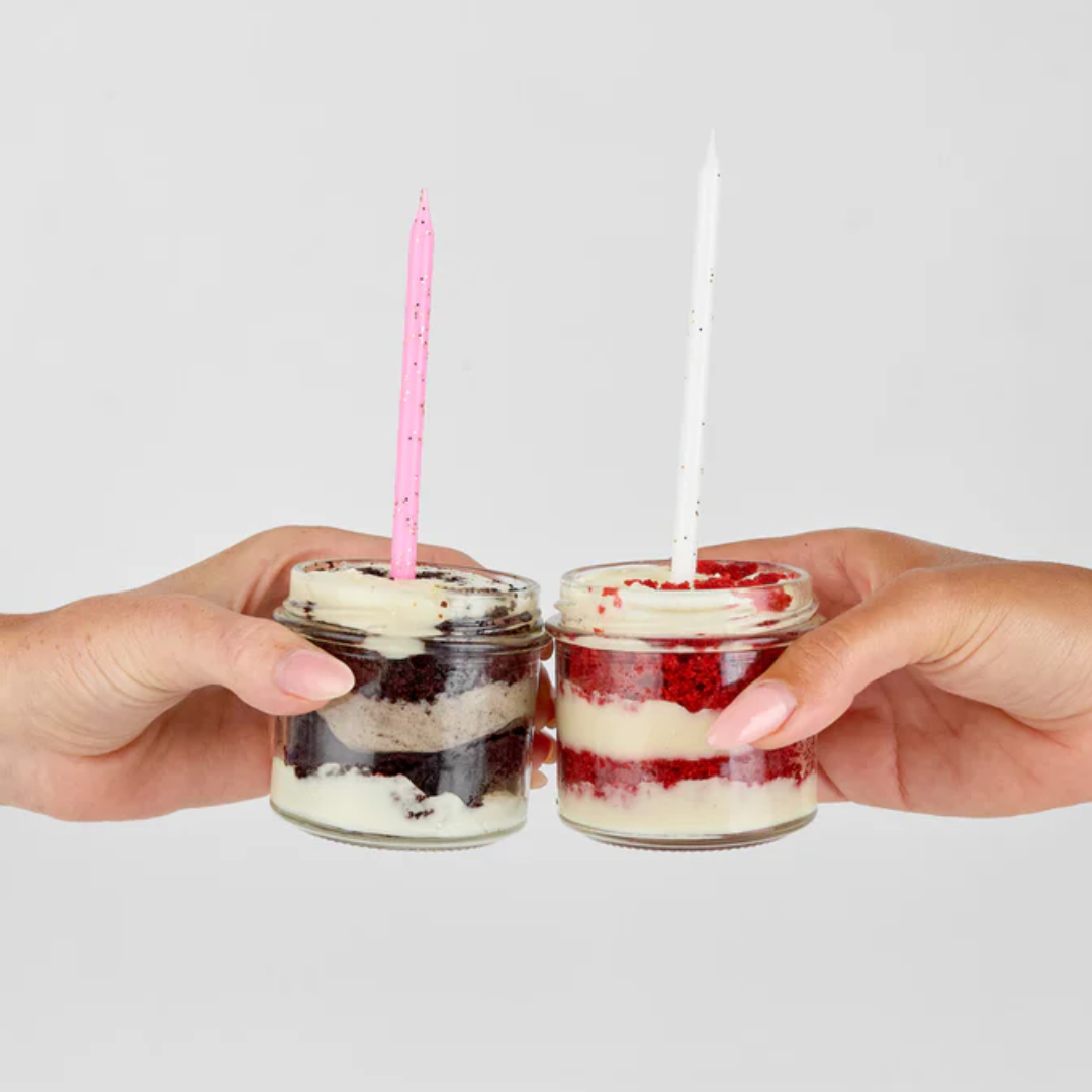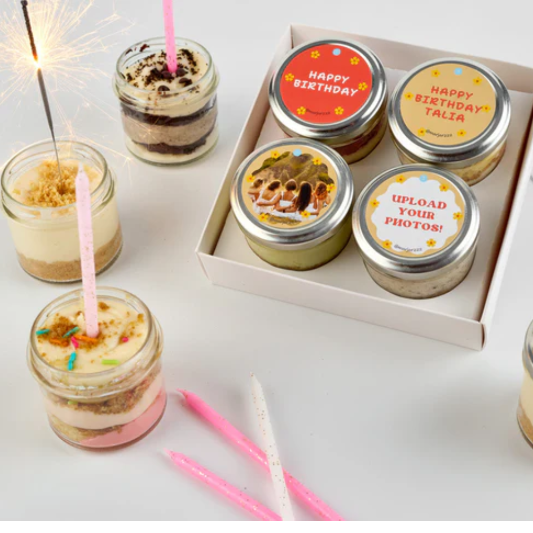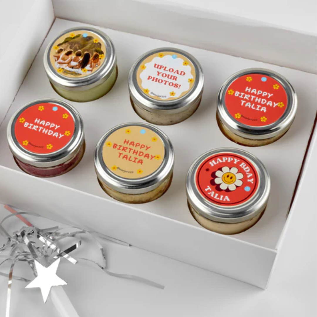 Looking for the perfect birthday gift? Personalized with a birthday theme, our classic box of birthday Cake Jars is just what you need! Each jar contains handcrafted layer cakes in a variety of delectable flavors including Red Velvet, Oreo Dream and Pistachio Cheesecake. What's more is that you can customize your jars with your own pictures.